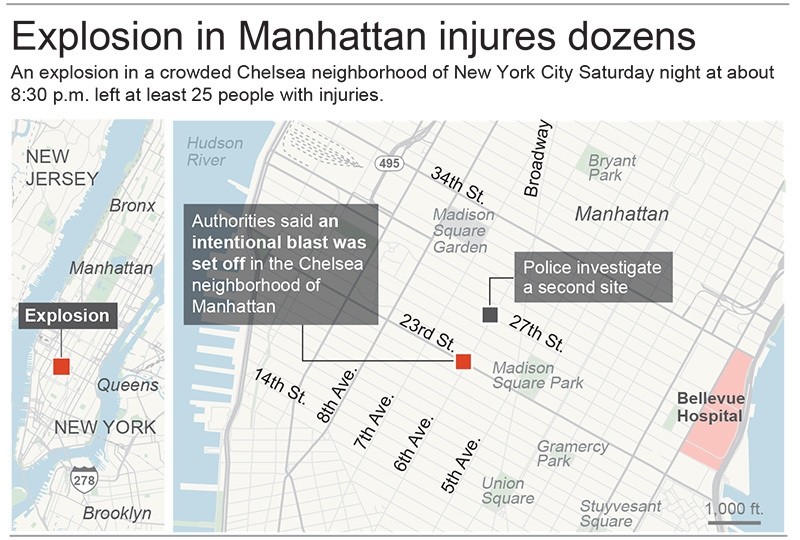 An explosion in a crowded Manhattan Chelsea neighborhood on Saturday night injured 29 people hours before world leaders arrived for a high-level UN summit.