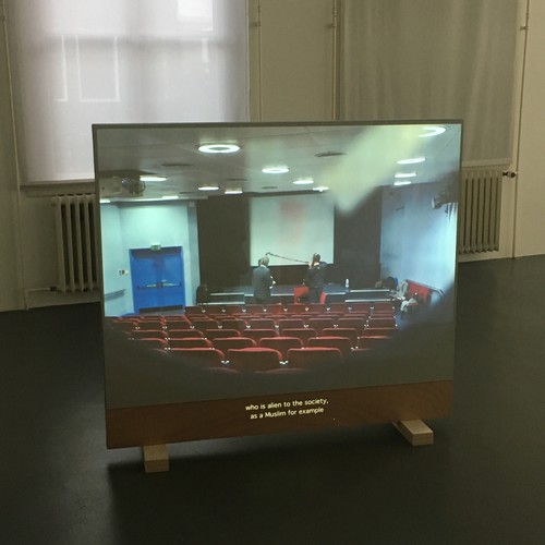 "Supposing I love you. And you also love me" (2011) is a 13-minute film that contains a site-specific installation that is a crescent shape and a projection. As a visitor you need to get into the installation and sit to see the film that consists of still photography and voice over by philosopher and theologian Tariq Ramadan with a group of people from Belgium and the Netherlands of various origins. The catalog describes the film: "Set up as a polyphonic mini-tragedy, following Ramadan's exploration of Nietzsche's description of tragedy as 'to be alone and individual... to face your destiny and your fate without having an answer'." As a film it has a different aesthetic due to crossfading still images, creating a layer where every origin melts to produce the diversity as Rotterdam. Although, the flow of the movie is a bit slow at the beginning, the special set up of the installation helps the film to flow with the voice over. We see "others" of the community talking about Nietzsche with the lead of Ramadan. As I learned from the catalog, he was appointed in 2007 to Erasmus University as Chair for Identity and Citizenship. He was also integration advisor for the city until he was fired for hosting a program on Iran's Press TV.