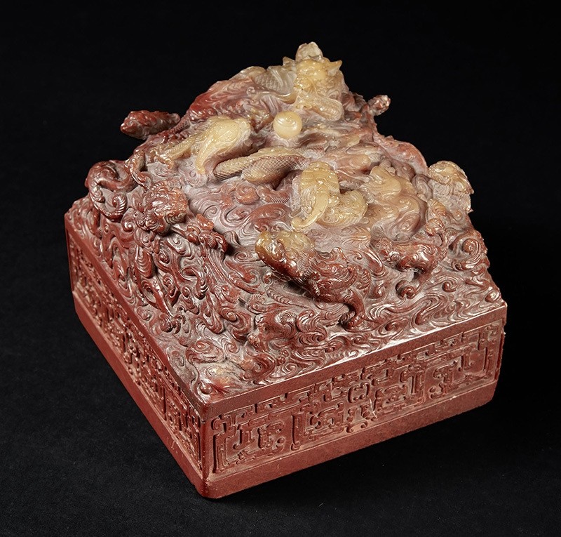 Decorated with stylised dragons, the symbol of imperial authority, the extremely rare stamp in red and beige nephrite jade comes from the Qianlong period (1736-1795).