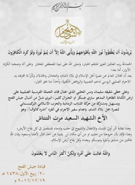 Jaish al-Fatah, a coalition of anti-Assad extremist groups including Jabhat Fateh al-Sham formerly known as Nusra Front, denied on Wednesday any involvement in Russian envoy Andrey Karlov's assasination after a forged document on its involvement circulated on social media.
