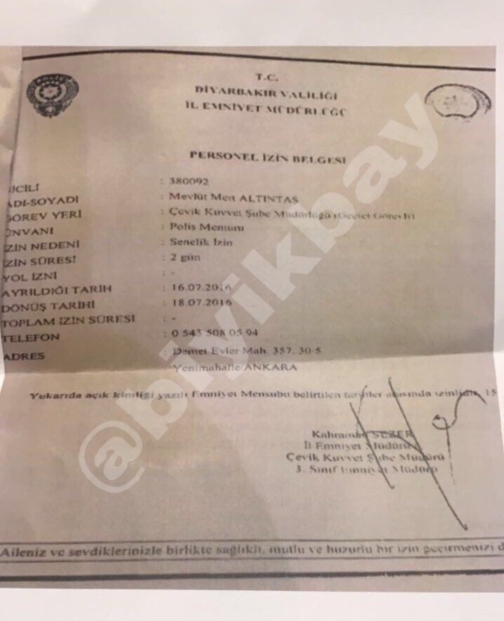 A document issued by the Diyarbakır Governorate shows that Altıntaş took two days of annual leave between July 16 and 18, right after the July 15 coup attempt, which was perpetrated by Gülenist militants embedded in the ranks of the Turkish military.