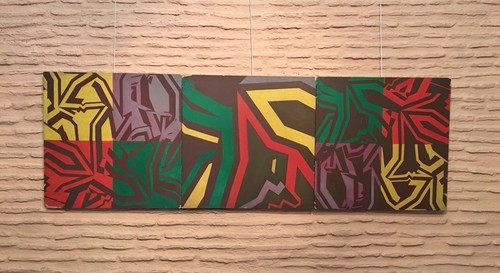 Housed in three contiguous rooms against flat brick aside mahogany-hued doors, the Op-Art of Altınok, as currently exhibited in Tophane, could be said to have emerged over the course of three basic developments. Firstly, a pair of his paintings in the collection are visibly more nebulous than the rest, almost completely vague but for pasty smears and runs of the various brush sizes he employed, dashing this way and that with a relatively colorless palette in one, and a more contrasted saturation in the other. They have all of the signs of a nascent chaotic phase before coming to fruition with more exacting clarity. Secondly, there are certain pieces that demonstrate a less diverse, more rudimentary and defined relationship to color, yet that play with the perception of texture through the placement of isolated, multilayered shapes. In the second phase, he is painting multiple canvases in one. From there, he departs from the motifs in the triptych toward repetitive patterns within concave-convex angles, provoking a sense of warped perspective and virtual space created by the mind when looking at such disorienting and unfamiliar variations in form and color. Finally, most of the paintings displayed at his Op-Art exhibit are dedicated to one central theme at a time, which he exhausts and intensifies with minute color grading and the subtle expansion and contraction of mirrored forms.