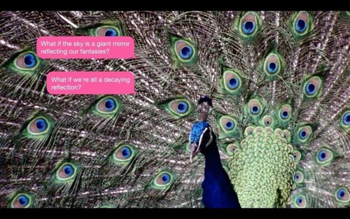 Comparable in its departure from reason is another film, the recently commissioned "New Acid" (2019), by Basim Magdy, who trained his Super 16mm lens on the anthropomorphic qualities of animals, shown in various states in the wild, yet with text captions that satirize the escapism from reality that social media and talk apps provide between otherwise obscure digital actors. "Perhaps karma has a short-term memory," asks a meerkat, to which another replies, "Karma is an elephant. It only remembers enemies."