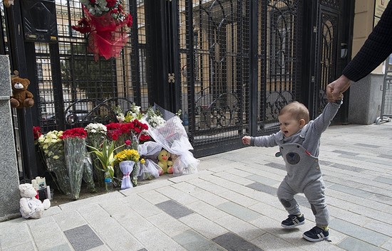 Flowers and soft toys at a makeshift memorial, for the victims of the fire in the shopping mall Zimnyaya Vishnya in the West Siberian city of Kemerovo, in front of Russia Consulate in Istanbul, Turkey, March 27, 2018. (EPA Photo)