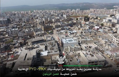 After the Turkish military and Free Syrian Army liberated the Afrin town center from YPG/PKK and Daesh terrorists on Sunday, fresh aerial footage showed that the civilians and buildings there remained unharmed.