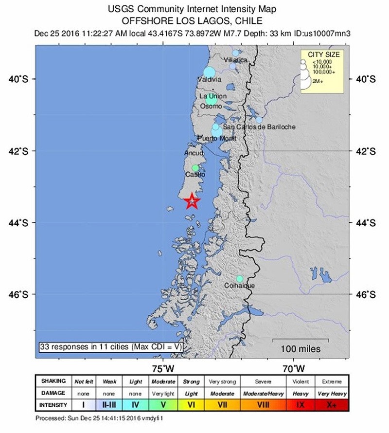 The U.S. Geological Survey said the magnitude 7.6 quake struck at 11:22 a.m. local time (9:22 a.m. EST; 1422 GMT) near the southern tip of Chiloe Island, about 25 miles (39 kilometers) south-southwest of Puerto Quello and at a depth of 22 miles (35 kilometers). The area, some 800 miles (1,300 kilometers) south of the capital of Santiago, is relatively sparsely populated.
