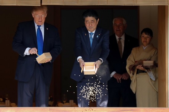 Amid the protocol and pageantry Monday, Trump and Japan's Prime Minister Shinzo Abe paused for a lighter moment — to feed Asian carp fish in a koi pond. Trump concluded the activity by theatrically holding out his wooden box of feed and dumping it into the water packed with bright yellow and orange fish.