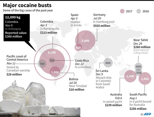 Colombia is one of the world's leading producers of cocaine, with output of around 910 tons per year, according to the U.S. Drug Enforcement Administration. Anti-drug police have confiscated 362 tons of cocaine this year.