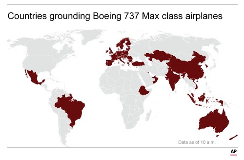 The full extent of the impact of the aircraft bans on international travel routes was unclear. There are about 350 Max 8 planes currently in service around the world.
