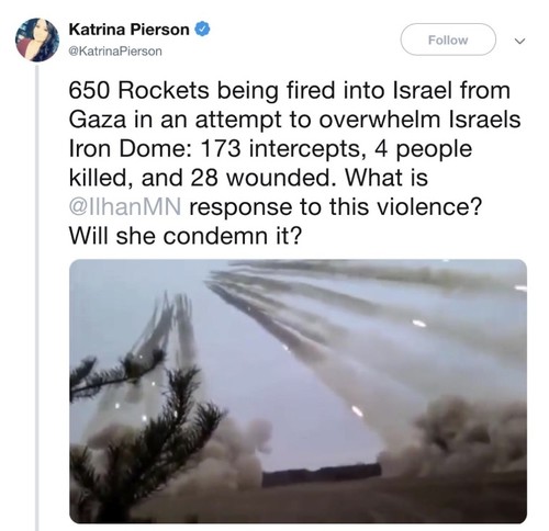 ''650 Rockets being fired into Israel from Gaza in an attempt to overwhelm Israels Iron Dome: 173 intercepts, 4 people killed, and 28 wounded. What is @IlhanMN response to this violence? Will she condemn it?'' she said on Twitter.
