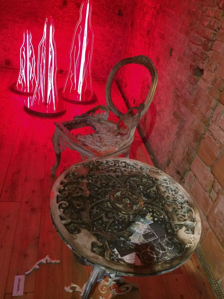 Another work from Kutluay's exhibition titled, "Aftermath," is composed of two Victorian-style chairs and a dilapidated coffee table, damaged by exposure to heat and dirt. The installation criticizes "the power struggle" that causes decay in people and communities.