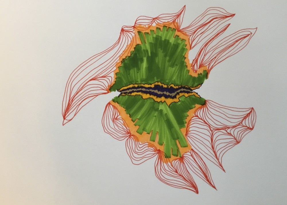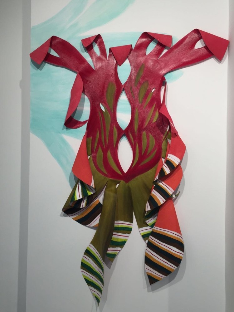 "What we show in the show are the four processes that I encounter while creating them," she said. "First the washed out plant shapes drawn on the walls, then I have that big landscape/plant hybrid called Cosmicela. ... After that comes the totally deconstructed wet red Spirelistra. And finally, the numbered seeds on reproductive paper and a mobile of nine different suspended plants connected by the same structure of balance... All this production came after Sefatoryum, so for me it is pertinent to observe their progression."