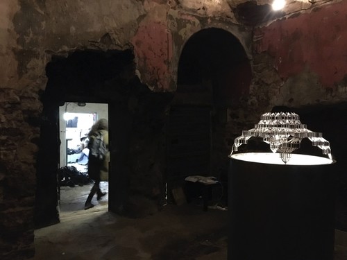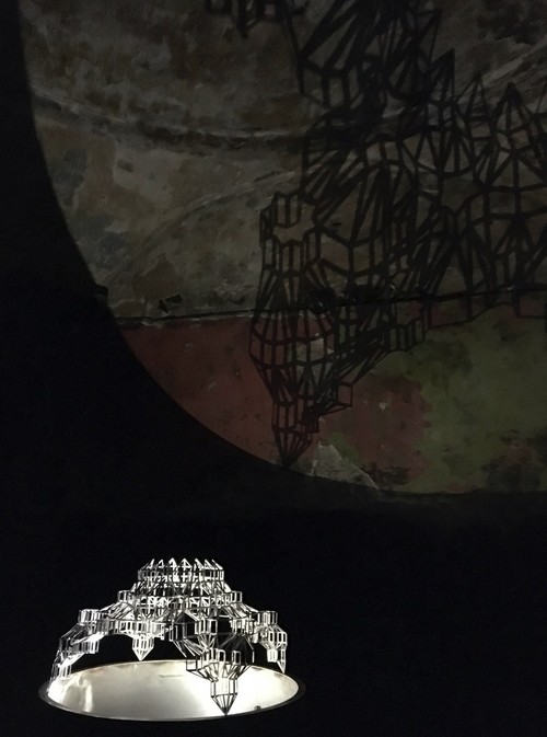 Sahand Hesamiyan adapted the sacred geometry of Islamic architecture with his essentialist aesthetic. A revolving light penetrates through his steel work to cast an optical illusion of three-dimensional shadows against the interior of a single-domed room inside Büyük Valide Han. Its effect is spiritual and enlightening as it uplifts the archaic forms of historical worship with timeless creativity. Hesamiyan reanimates the decrepit burdens and sobering realities of the age with a liveliness that evokes the innocence of a first-time traveler.