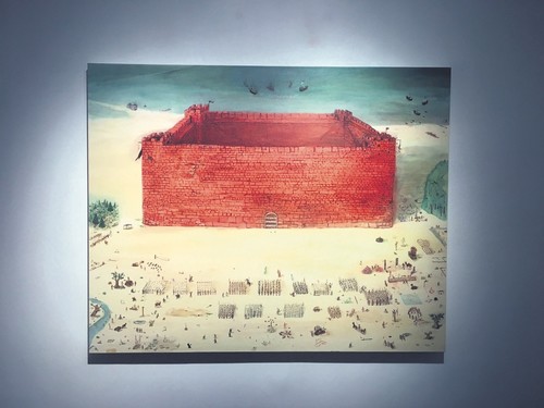 Downstairs into the nether regions of the exhibition space, the initial piece is made from found material, the fabric of a wedding party meant to be signed by guests. He transformed it into a conceptual remnant of punk graffiti with the simple design of construction bricks sketched over it. Arzık explained his acquired taste for street humor as the bassist for psychedelic surf-rock band Palmiyeler. In the hallway leading to the main exhibition space, the final piece from his "Death" series titled, "Passage" is a grandiose play on the opposites of the military-industrial complex in confrontation with the idyllic innocence of remote living immersed in nature. Uniformed men from varying world traditions march in an uppity column from the scarred earth of a mining project toward the riverine settlement of a peopled ecological village. Spectacularly distinct, and unforgettable in the exaction of its imagery, "Passage" has all of the antiestablishment satire of fellow Turkish painter of the previous generation, Mevlüt Akyıldız, while conveying a spiritual appetite honed with a visionary symbolism also found in the works of California painter Mark Henson.