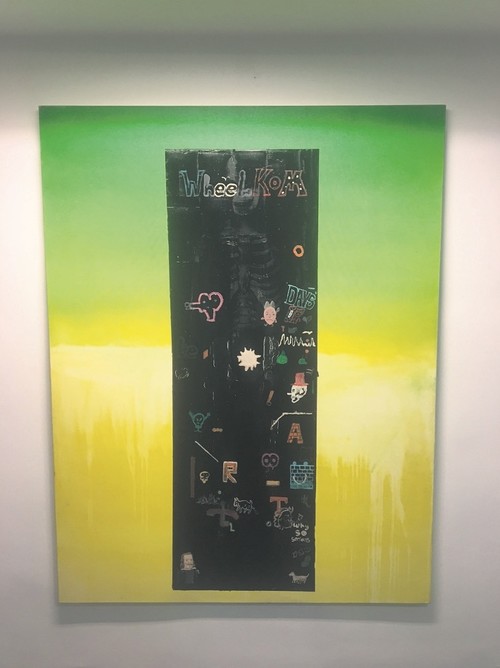 Aside the macabre horseman, he emphasizes his particular talent for opaque sable black of the darkest kind against a glaringly saturated, tawny lime palette. Out of a monolithic rectangle that seems to have been transported from the set of "A Space Odyssey," there emerges the white shades of human bones, a lower spine, a ribcage, a skull. Notebook sketches appear with a seeming randomness where the skeleton disappears, his eye sockets covered over with the multicolored lettering "Whellkom" (2017) to introduce viewers to the ghastly realms of the subconscious where mortal fears take shape.