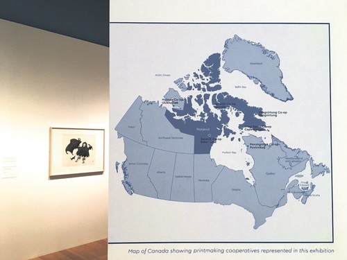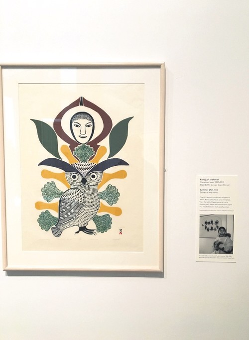 "Summer Owl" (1975) by Kenojuak Ashevak is the lead piece of the exhibition as she is one of the best known Inuit artists.
