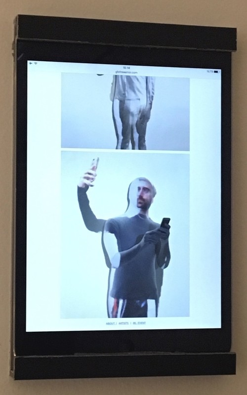 "Selfie Series" by Tom Galle is shown on a mini tablet touchscreen where viewers interactively scan through the works as they would on a social media platform. He has a sharply critical eye for the smartphone aesthetic, objectified for all of its pure indulgence in the shared fantasies and collective consensus of computerized identity. There are political metaphors at hand in such creative media criticism, comparing the guise of democracy as nothing more substantial than the whip of red fabric before a charging bull, as the voting public is skewered and humiliated before the multitudes of abstainers. It's placed diagonally across from a video "Untitled" by Jacques Urbanska and Franck Soudan, which is networked to a server to generate imagery that never repeats itself, emitting an endless stream of everything from war-torn Iraq to a rotating multi-armed excavator over a barren construction site.