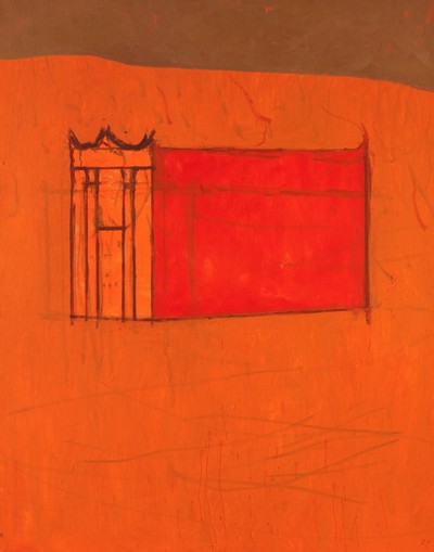 From his early Temple Paintings (2003-2004) series, Aytekin's first piece, "Temple I" (2003), explores the lines and forms of architectural emptiness through color in an oil on canvas.