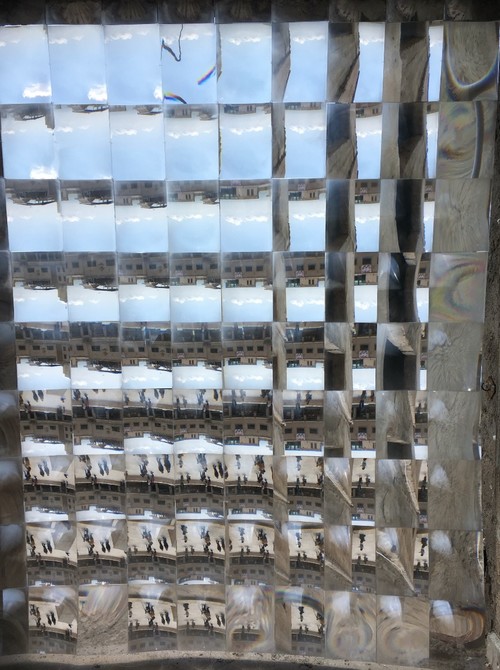 In an open-air area in the same building stands Gizem Aksu's site-specific installation. She installed a PVC plate that mirrors the city panorama reversely on multiple frames that reflect different images with variant light. The artist seeks to offer an alternative and upside-down point of view for the visitors with her work titled "Shelter, Barricade, and Nature."