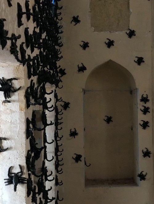 MERKEZKAÇ, "Moments of Ecstasy," 2018, site-specific installation, 1000 pieces of polyester scorpions, window, room.