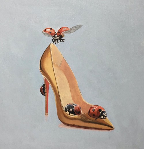 They keep ogling her lost heel. In time, a buzzing of insect wings is heard approaching through the cerulean ether. A quartet of ladybugs land on her abandoned shoe. One climbs up the stiletto. Another lands, wings outspread, on the heel, as the other two, somehow larger yet still dainty, explore the point. The ladybugs are transfixed to the object whose aesthetic and purpose is kindred to the name they assume with natural authenticity. Elsa Ers stood the longest to capture the moment as it graced the collective subconscious, when she fished it out of the reaches of the imagination to arrange the feminine insect with a likely, though an artificial friend from the human kingdom, a high heel. It is one of 13 paintings that decorate the walls at Pg Art Gallery for her second solo show, "In Absentia," to evoke a very human death of nature.
