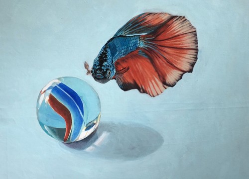 She has really come for dessert. Her greed is shared by the world, as she sits alone wishing that she could eat and buy everything. She looks across the restaurant toward the entrance and espies a dragon-like fish immersed in blue light, attracted to a glass marble in which the colors of its electric indigo body and florid ginger tail are reflected. "It is Narcissus," she tells herself, imagining the mythical personification of selfishness, long submerged in the waters of its visual echo where it has ever spent lifetimes looking at itself. "I am in beautiful company," she thinks.
