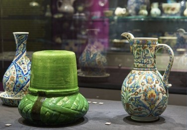 The museum's permanent collection has a display of Kütahya ceramics, most from the 19th and 20th centuries, kept beside a diverse array of pieces from İznik, as the ceramic art of the two cities is intimately intertwined. Behind its two polished glass cases, there is a sugar bowl from 1921 painted in typical, light Aegean blue with the Greek letters for Kütahya. Opposite the intricate floral patterns that embellish simple trays, jars, figurines and ornaments, there are large roundels bearing the eight most important names in Islamic history: Allah, Prophet Mohammed, the caliphs, Abu Bakr, Umar, Uthman, Ali, and the Prophet's grandsons Hasan and Husayn. It is understandable simply by looking at the visual developments in the work, and when steeped in the clever, museological arrangement, how in the late 19th century, there was a revival in Kütahya ceramics due to renewed inspiration in creative dialogue with the legacy of İznik. In the spirit of Sadberk Hanım, her philanthropy and intelligence, the museum is a testament to her passion to preserve her cultural heritage in concert with the public, by collecting, repatriating and curating some of the finest creativity in the country by workers and masters of tradition.