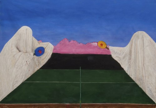 Most of the still works and installation objects at "Earthlings and the Space Problems" are untitled, except for two, "The power of the future" (2012), a compact, mixed media piece with tiger stripes behind a miniature painting of two enigmas in a dim landscape, and "XO" (2017), titled after a Beyonce song, one of his tongue-in-cheek barbs, a broad, 300cm-wide pastel on cotton reanimating her controversial music video intended to honor the victims of the 1986 Challenger disaster, when the entire crew of a space-bound craft went up in flames. NASA had responded with a stiff upper lip. They were not impressed. It is just the sense of humor that Ural conveys well, obliquely dark, to the effect of a sideswipe against the collective subconscious.