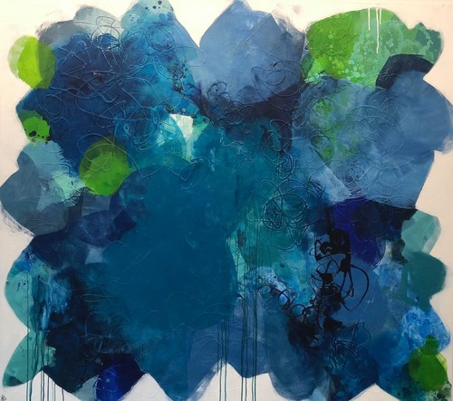 reminiscent of the abstractionist master Abidin Elderoglu, who recently had a posthumous retrospective accompanied with a comprehensive book publication of his life work all produced by Dirimart as well. The works are unique from each other mostly with respect to varying color schemes, which spark and fade across the frames, dialoguing brightly with emptiness and visually evocative of lily ponds. Only one piece, "NR05" (2018), is more opaque in its composition, filling the space with an overlap of aquatic, liquid shades textured with swirls of action paint that seems to have fallen ever so slowly, gently onto the exquisitely succulent palette of waterlogged forms.