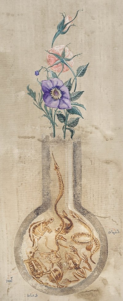 Morova frequently depicts the final polarity between life and death, resurrecting an attention to the botanical details of flowers that recalls the bygone aesthetics of Islam's golden ages of learning, when scientific process integrated a mystical affirmation of the natural world, when the planet was understood as a hidden trove of philosophical truths. His eye for color and its absence is especially vivid in his vegetal stills. Violet and coral petals grow from a pot of skeletons. A circular frame has a calligraphic body with a haloed skull pointing upward with a red rose and downward with a dead flower the color of the yellowed backdrop.