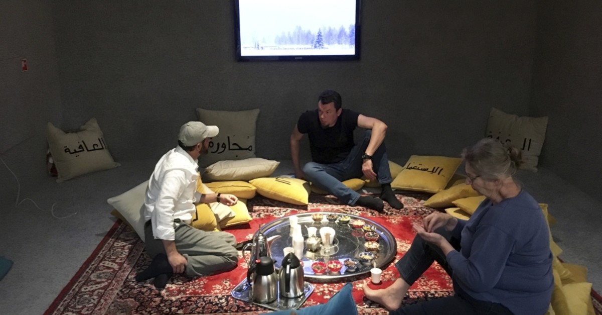 Imagine a teahouse in the middle of an art museum, it is more possible to encounter a cafe but this show welcomes you with a teahouse, Al Madafeh/Living room: the right to host and to be hosted, (2016-ongoing) running by an Afghani-Dutch artist Shefik as part of Hilal and Petti's exhibition.