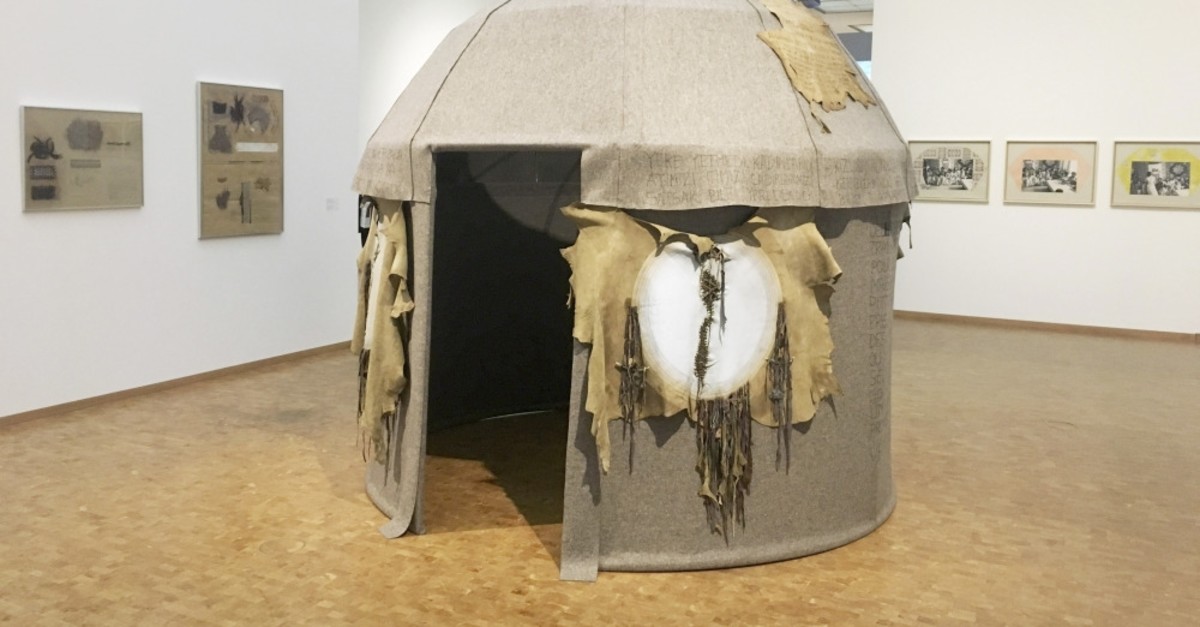 "Toprak Ev" ("Clay House") (1974) is a work that I haven't encountered before and which got my attention quickly as it is placed in the middle of the exhibition. It is a portable tent used by nomads in Turkey. In English such tents are called "yurts" and it is a striking coincidence that the same word yurt is also in use in the Turkish language, meaning homeland. That annotates an interesting contradiction that nomadic life doesn't accept a permanent settlement, therefore, having a portable yurt makes your homeland where you are. Yalter uses excerpts from a well-known Turkish writer Yaşar Kemal on the yurt. Kemal's books mainly center on nomads and nomadic lifestyles and how these changed with the onset of Turkish modernism.