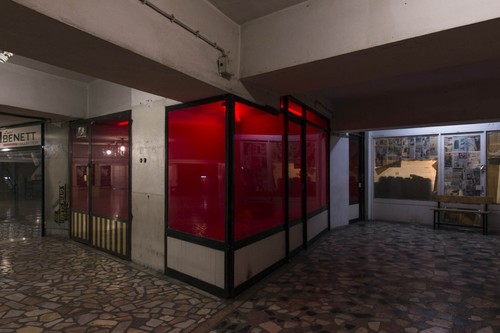 The contrasts from dark red to spotlight white are eerie, conjuring the unsettling specter of an outcast at the edge of modernity. The rebel, the other, the worker, the opposition strikes fear into the heart of civilization, a conflict of paradigms that defines the classist elitism of contemporary art. But the only place light enough to read at PROJEKTÖR is inside the fort of decommissioned boxes. It is only there where education is possible, the most potent catalyst for social change. Much of the rest of the seventh floor at Gürün Han is abandoned, but until June 1 it will feel like someone previously unseen had been there for a long time.