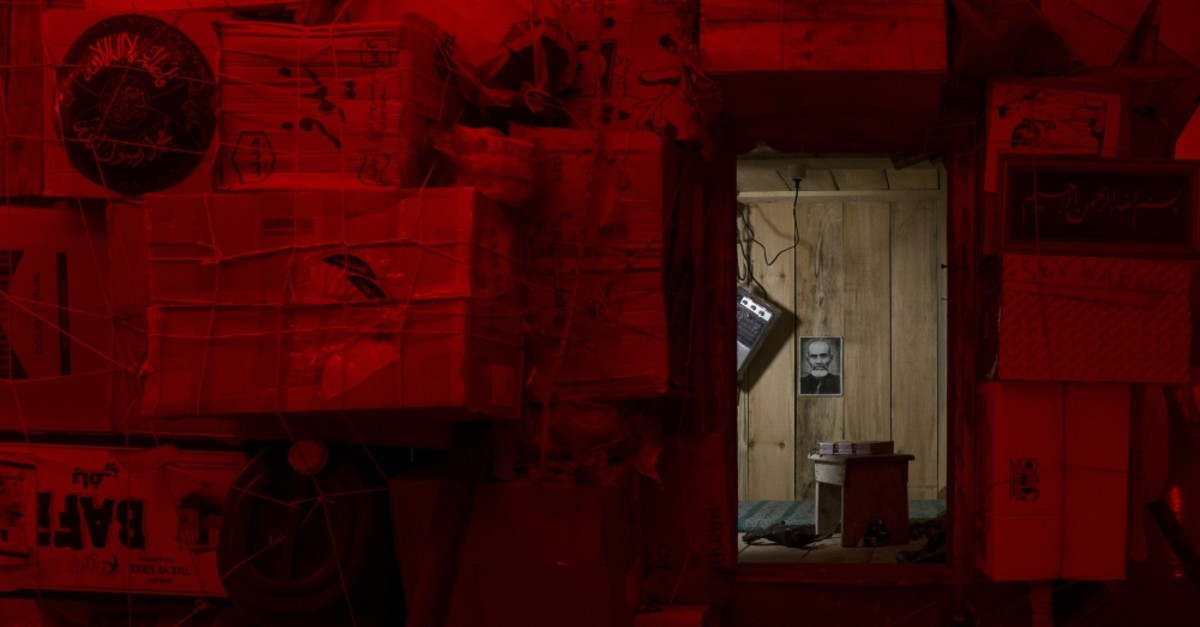 Inside the fort of boxes, a book with Atatürk on the cover has been left closed, its spine taped from wear. There is a portrait on the wall of a bald, bearded man. A transistor radio spouts white noise dangling from the ceiling. Next to it, a birdcage hangs above a horse figurine, evidence of a new generation born in isolation. The piece relays a sense of remoteness and abandonment from the world.