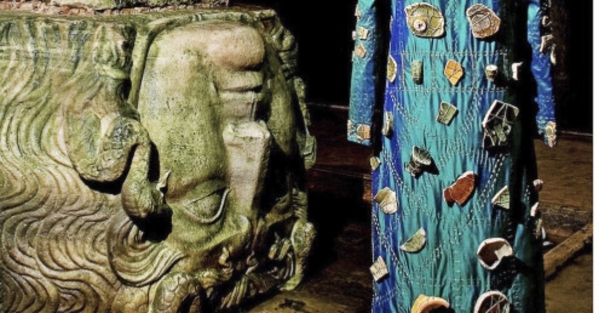 In each of the 12 images displayed at the best lit section of the second floor exhibition in SALT Beyoğlu, the centerpiece is a dress, dyed in a fluorescent aquamarine hue, with its white stitches showing simple, crisscrossed patterns. Within each shape of sewn textile, there are fragments of what look like antique ceramics. It is the garment of a ghostly wanderer whose voice speaks in the silence of stone.