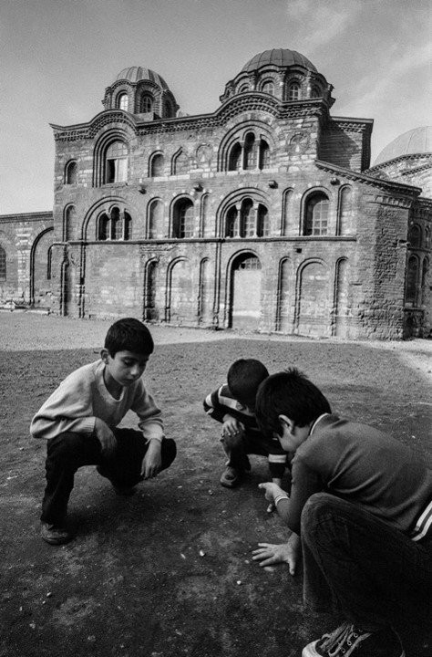 A photo by Ara Güler, showing children playing outside in Istanbul's Balat district.