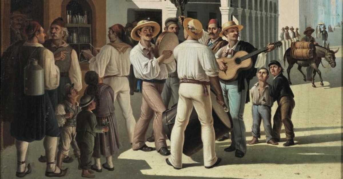 The castled island had been Venetian since 1401 until the French seized what was one of the most fortified European cities in 1797. For seven years, an Ottoman-Russian alliance gained nominal control. But by mid-century, it would share in the heritage of the lands encompassed by modern Greece. The fez appears strikingly Ottoman in a painting by Charalambos Pachis titled, "May Day on Corfu" (1875-1890). A man in a group of revelers wears a red, tasseled cap, columned and stiff, unique from the Corfu variety, and glares back directly into the artist's gaze.