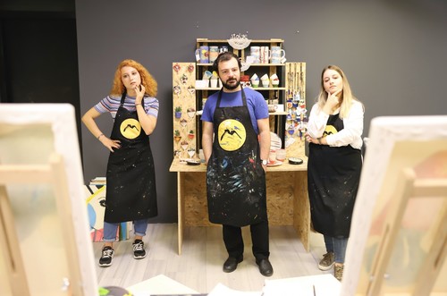 The trainer of my workshop was Mehmetcan Yaman, one of the founders. Before starting to paint, we had a small discussion about art and the workshop. He began talking about their establishment: "I graduated from Yıldız Technical University Combine Arts Department. My childhood friend, Can Tulay, is a lawyer. I was always talking about art when we were together. One day, he wanted to try to do some painting. After he tried, he said it was a very good activity to let it all hang out. When I saw that he understood and managed to do some art, I also liked it very much. Then, the idea to open a workshop occurred to us."
