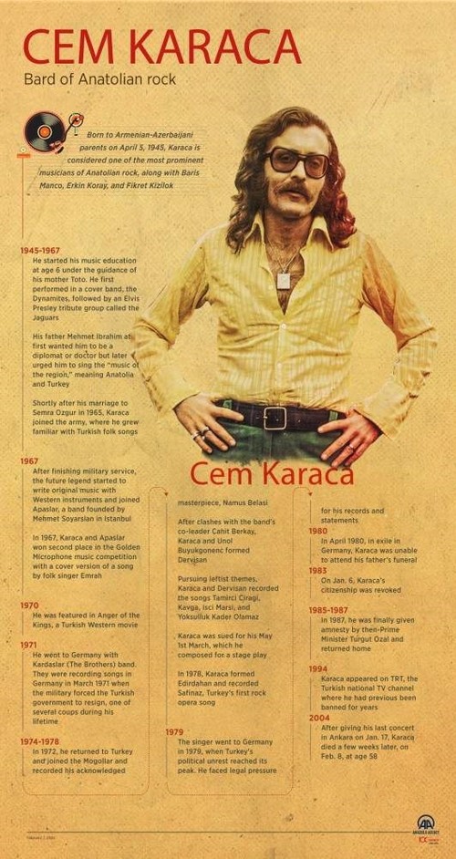 Cem Karaca was one of these prominent musicians of Anatolian rock. Although he was planning to be a doctor or engineer in his youth, he later could not stop the urge to sing the music of the region. During his military service in 1965, he heard many Turkish folk songs. "I used to view it as old and primitive, but I realized that it expresses my feelings," Karaca once said to an interviewer. Then, he joined Apaşlar band with whom he performed great songs like Resimdeki Gözyaşları (Tears on the Picture). Leaving the band with bassist Serhan Karabay to form Kardaşlar (The Brothers) band, Karaca recorded songs in Germany with this band. In 1972 he was back in Turkey and joined the band Moğollar and recorded his renowned masterpiece Namus Belası (Honor Trouble).