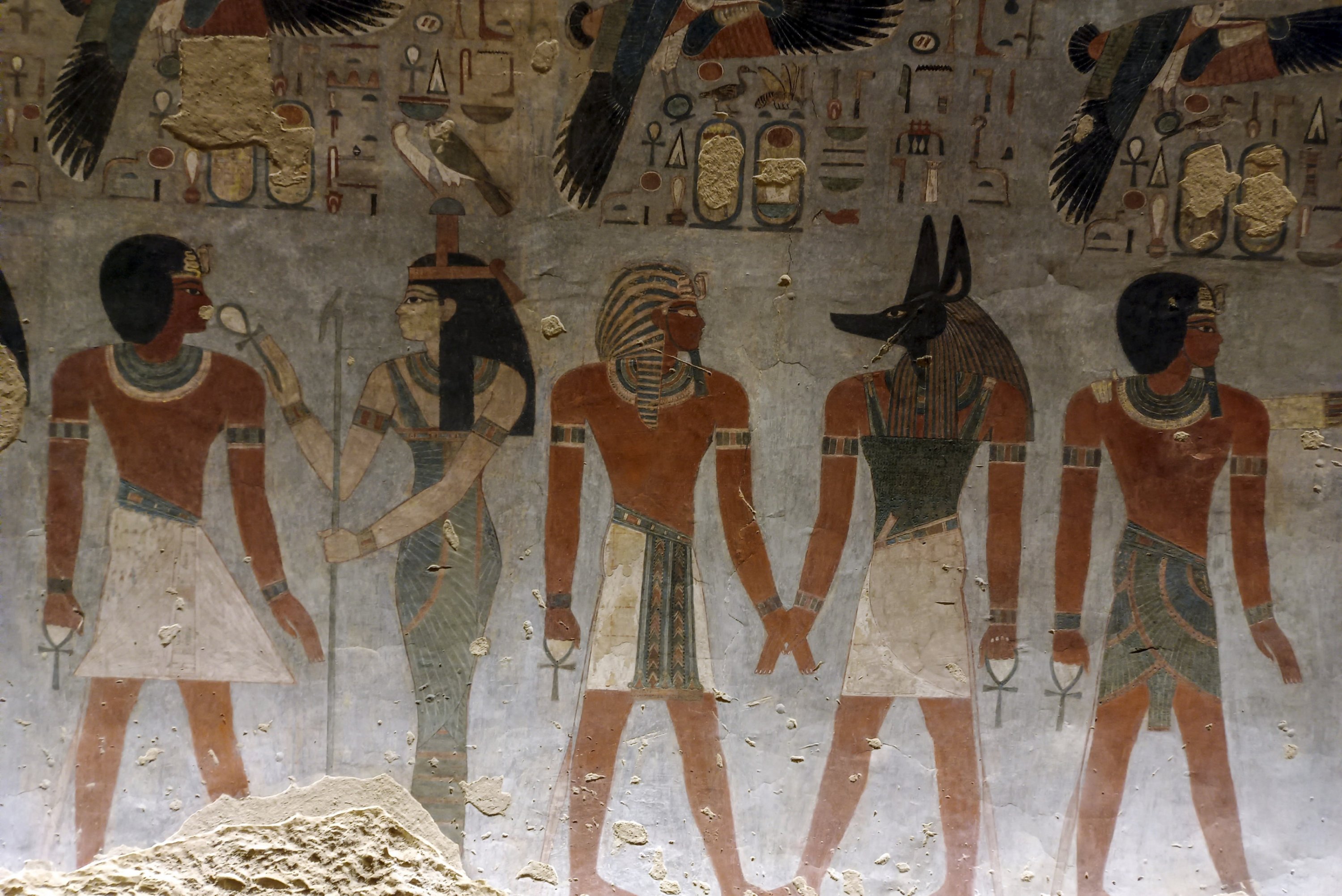 The tomb starts with a 36-meter (118-foot)-long, 14-meter (45-foot)-deep, downward-sloping passageway beneath the Valley of the Kings. It includes a main burial chamber for the king and two other chambers for his wives, Queens Tiye and Sitamun.