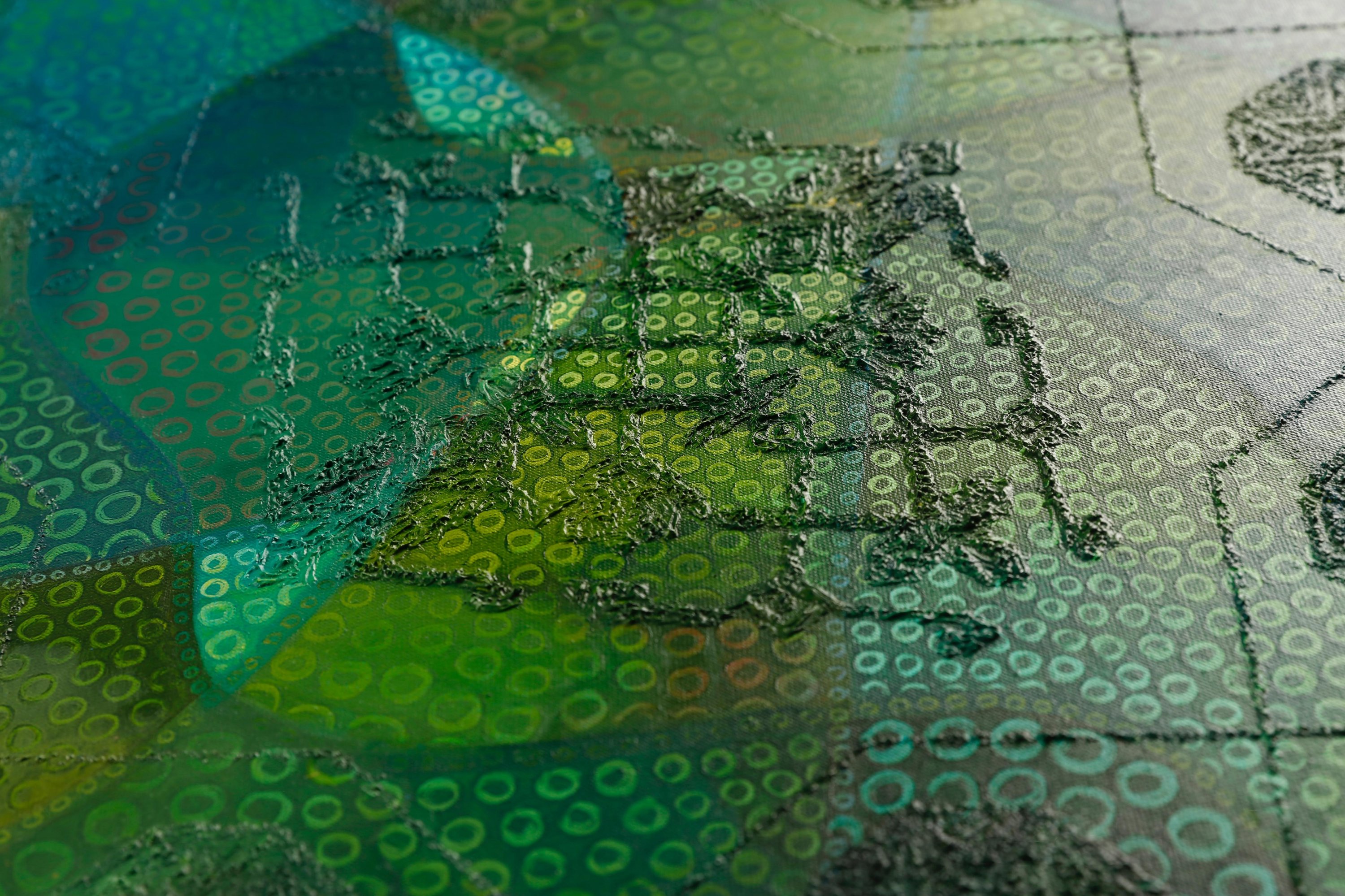 Özcan’s work draws attention to unnoticed values and cultural memory amid the rush of modern life. Inspired by Anatolian carpet motifs, she bridges the past and present, integrating traditional elements into contemporary compositions. Her piece "Cennet Çiçekleri" ("Heavenly Flowers") features carpet motifs, expressing patience, hope and excitement. Dense areas of color represent moments of life’s tempo, while fading colors depict the voids created by what is missed in the rush of daily life. The energy of her compositions resonates strongly with viewers.