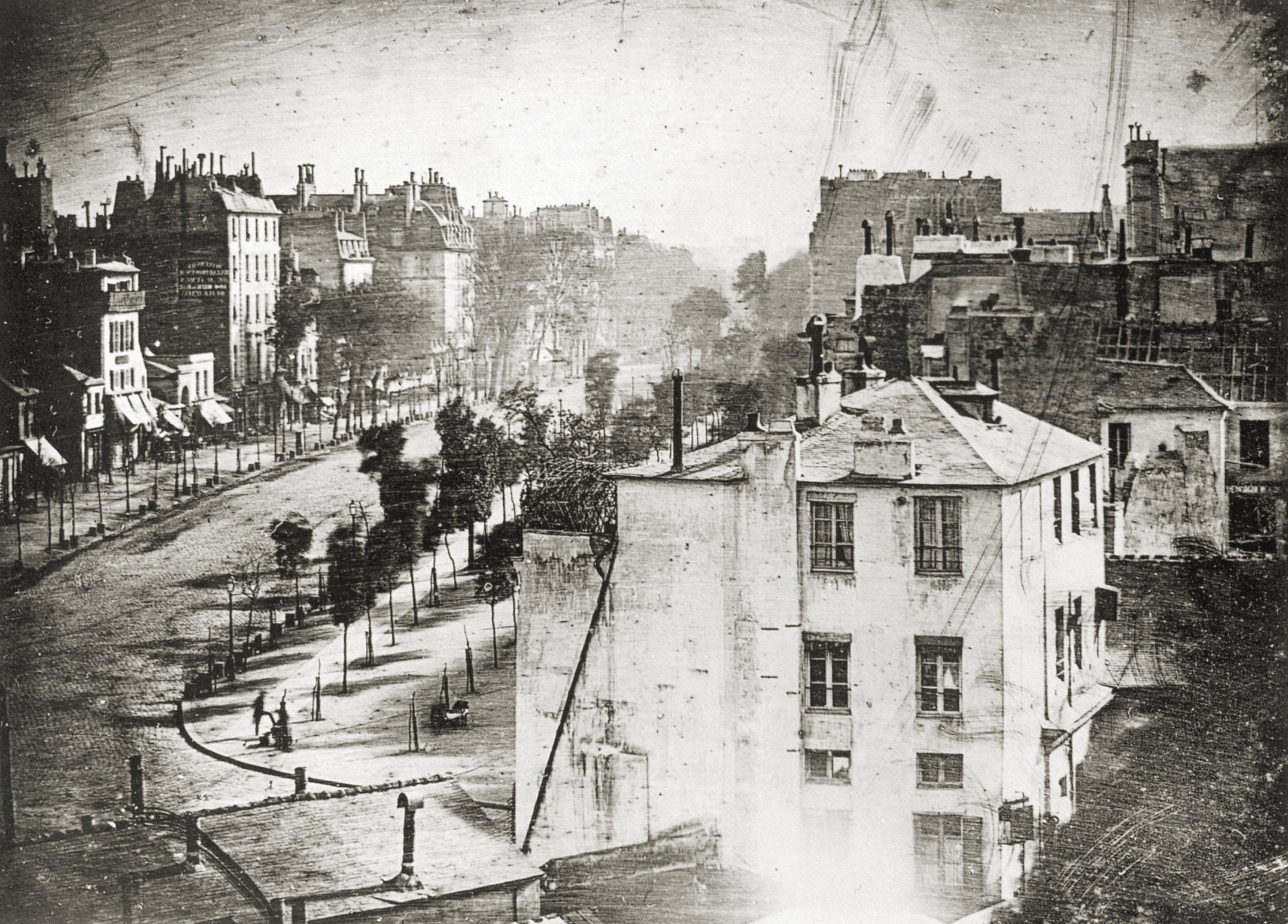 The height of the frame is no coincidence. Daguerre’s gaze does not come from the street but from above. This is not the perspective of the individual but of order itself. The avenue is wide; the trees are aligned; the buildings are disciplined. Although Haussmann’s massive urban renovations have not yet begun, their mental infrastructure is already in place. The city begins to shift from a lived space to one that is seen, planned and controlled. Photography stands as the silent witness to this transformation.