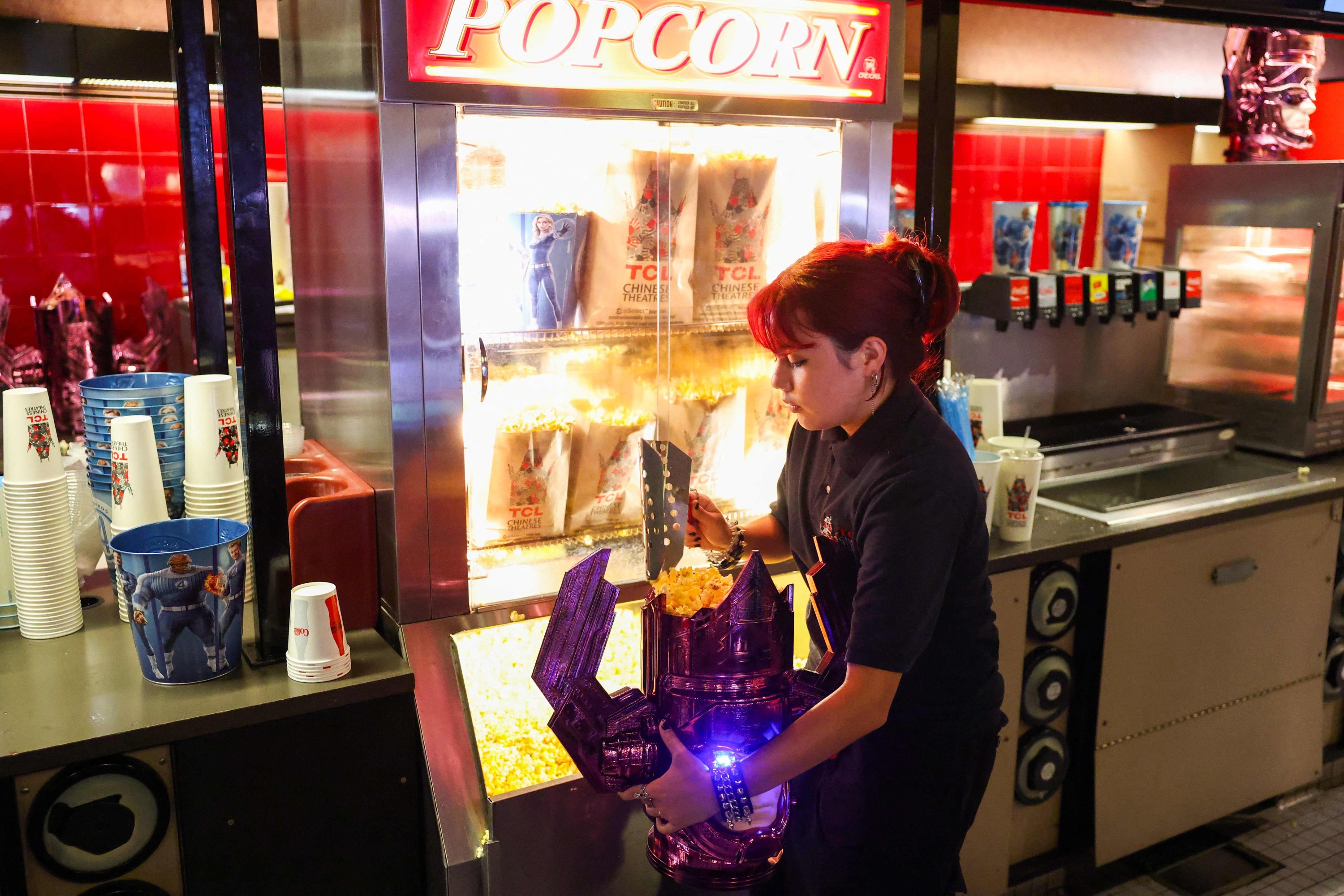 The record-breaking popcorn bucket is filled with popcorn at the TCL Chinese Theater, Hollywood, California, U.S., July 24, 2025. (AFP Photo)