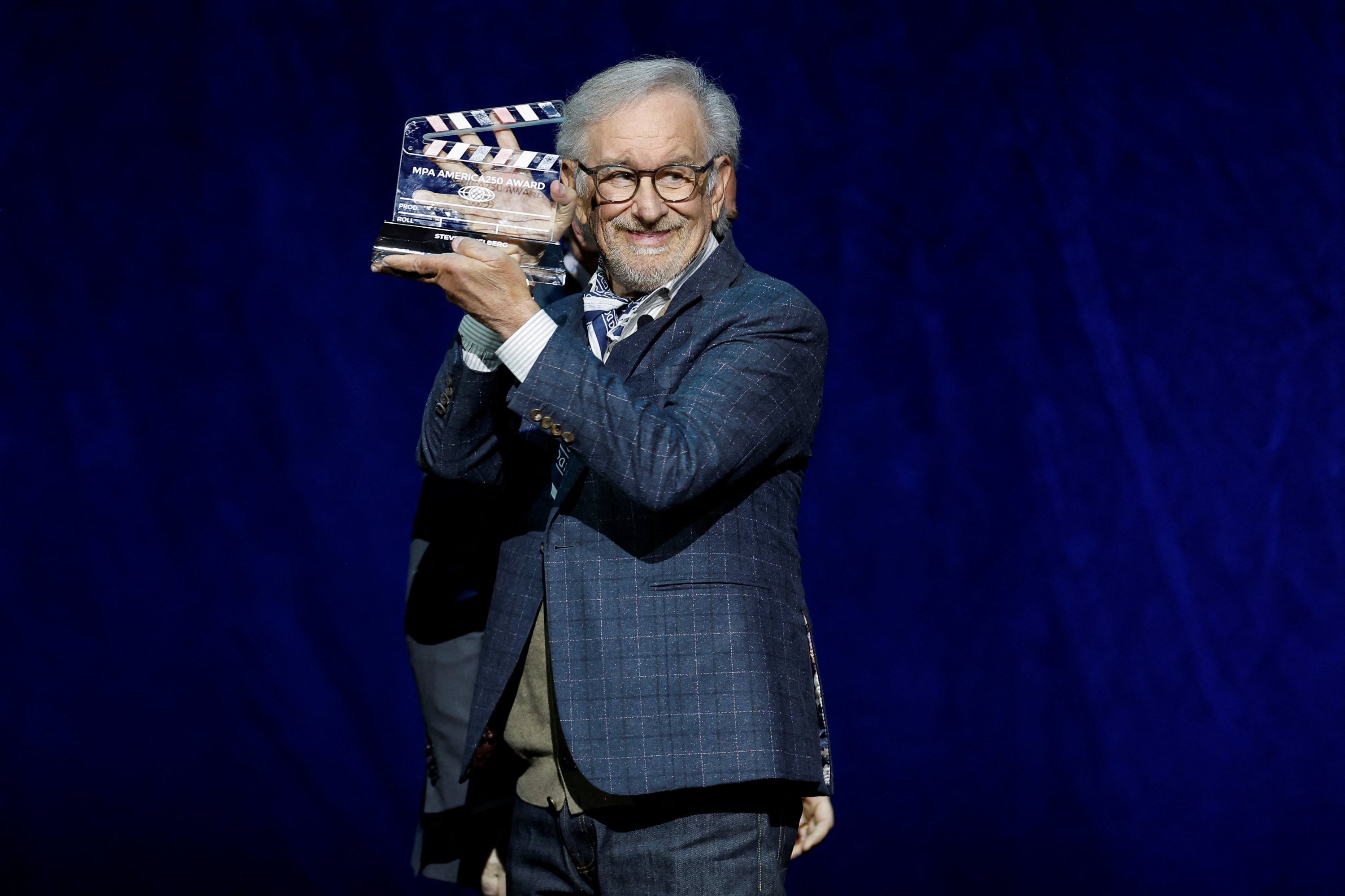 Steven Spielberg holds up his MPA America250 Award during the Universal Pictures and Focus Features presentation at CinemaCon, Las Vegas, Nevada, U.S., April 15, 2026. (Reuters Photo)