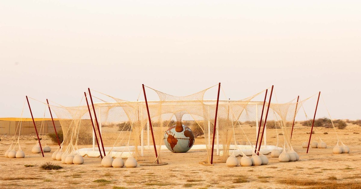 At "Our Habitas Ras Abrouq," Brazilian artist Ernesto Neto reintroduces "SlugTurtle, TemplEarth," a large-scale interactive installation previously shown in the Zubarah desert.