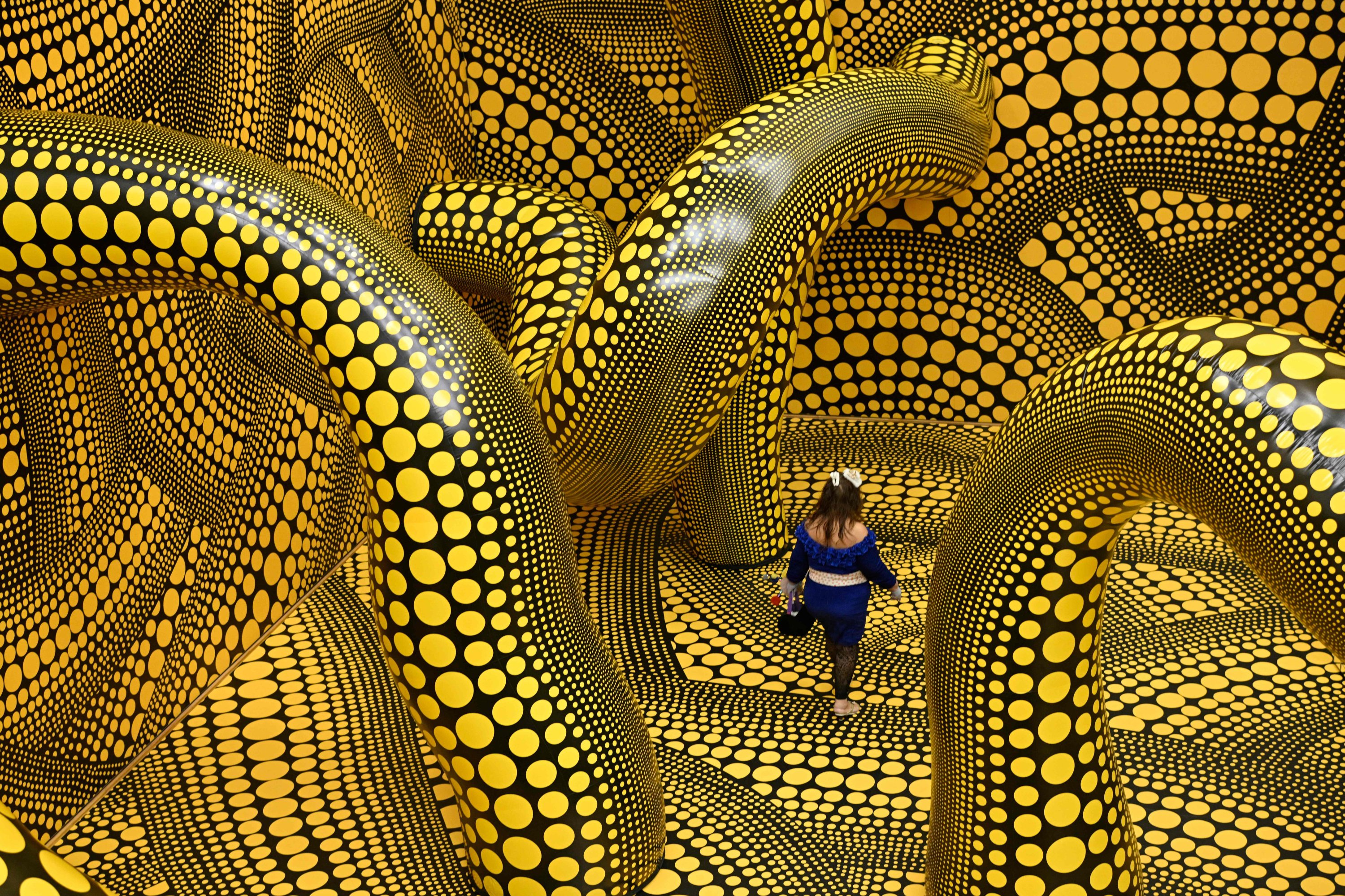 Works include her series "My Eternal Soul, 2009-2021,” including a patchwork of paintings, to "The Universe as Seen from the Stairway to Heaven” - made of mirror, glass and acrylic sheet. The museum entrance hosts her widely-recognized 2009 "Pumpkin” of fiber-reinforced plastic and polyurethane paint, belonging to Museum Voorlinden in the Netherlands.