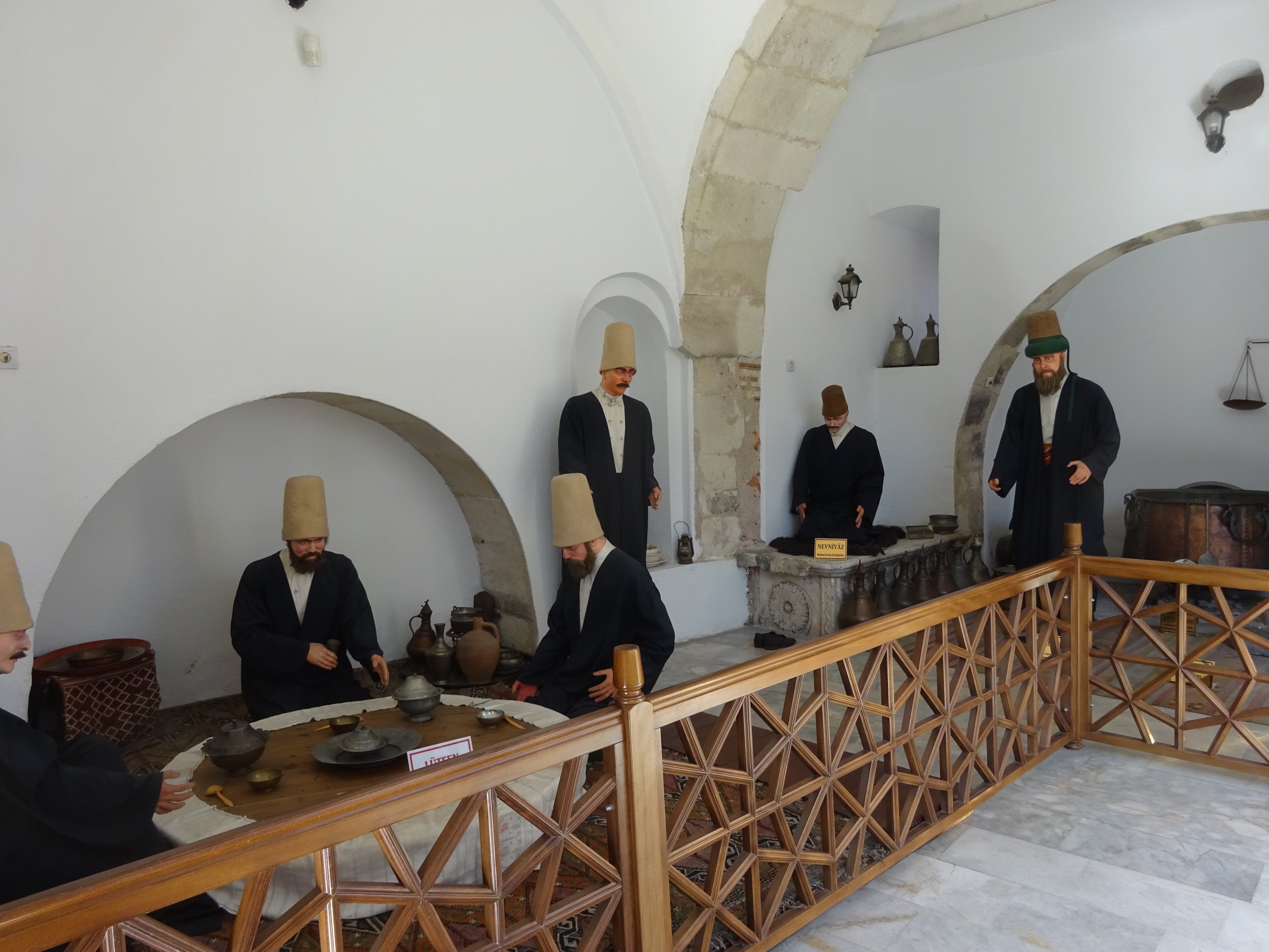 A separate sign also reveals that this room is the most important section of the Mevlevihane, and it is the kitchen. At first, this might seem odd for an order that is dedicated to at least some degree of worldly renunciation. However, the sign makes clear that the importance of the kitchen is not food-related but rather educational. It is in the kitchen that the continual education of the dervish, which lasts all their life, is undertaken. And, in this light, airy space, there are numerous mannequins of dervishes, each devoted to his own particular task.