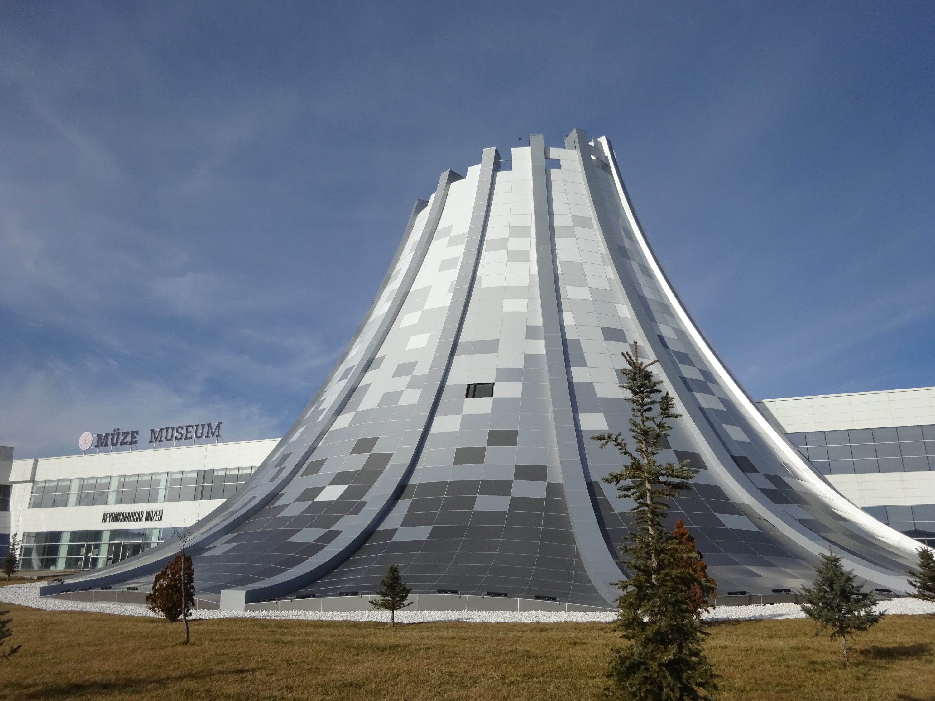 The museum, which is located some way to the west of the urban center of Afyonkarahisar, is easily recognizable by its huge concave grey cone that reaches up into the sky. This is not merely some distinctive form of roofing, but itself contains exhibit space in addition to that of the ground and basement levels. On the second floor, within this cone, there is a part of the Ethnography Section dedicated to Rumi and the Mevlevi Order. Yet, this cone may have even more of a connection with Rumi than that, for an official connected to the museum told me that the cone represents the rock-sited castle which dominates the city and from which Afyonkarahisar derives its name, in addition to representing the flared, flowing robe of a whirling dervish.