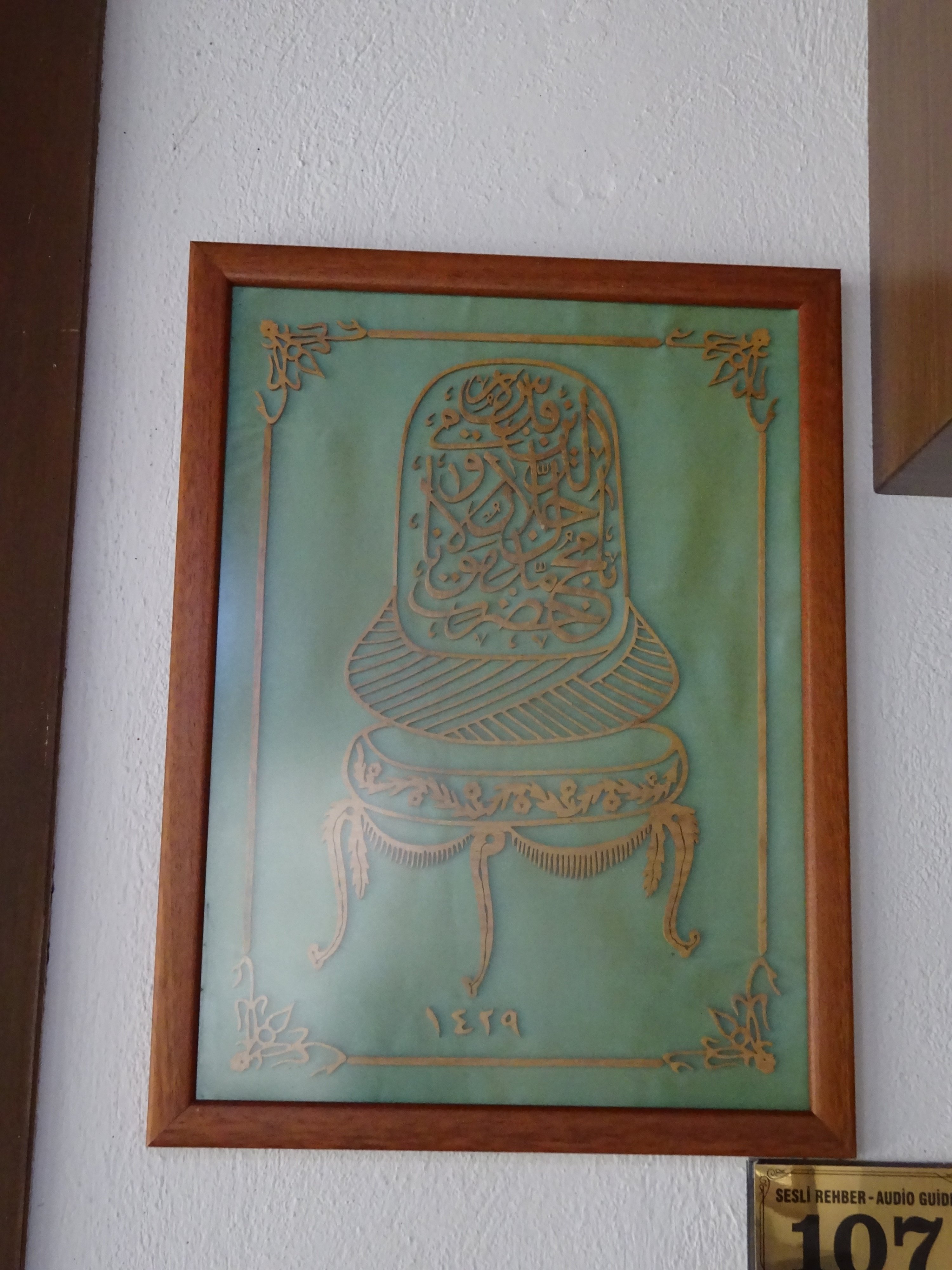 There is also a framed piece of calligraphy that reads “Ya Hazreti Mevalana” – meaning “O Your Holiness Mevlana” – and which is dated to 1324 of the hijri Islamic calendar, corresponding to 1906-7. This is a tasteful and apt piece of calligraphy, it being simple golden writing offset against a background of dark blue, yet the calligraphy itself seems to have a grace of movement to its letters, which can be thought to reflect that of the swirl of a dervish in their revolution.