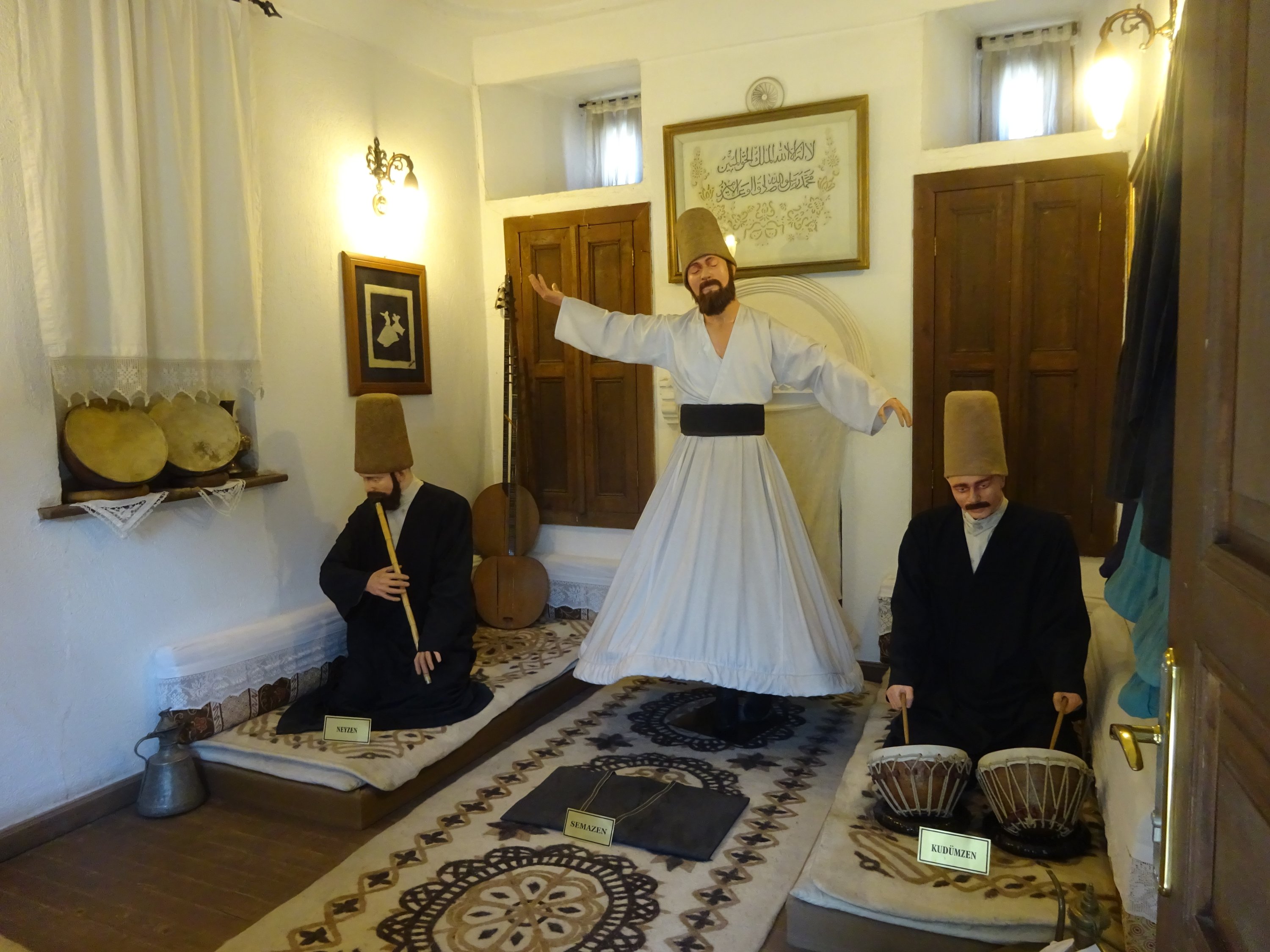 The next cell has a collection of mannequins, including one that the visitor would surely be expecting to see. Between two dark-robed dervishes playing the ney and the kundum is a whirling dervish in white, hands outstretched, one palm up and one down, and lost in reverence.